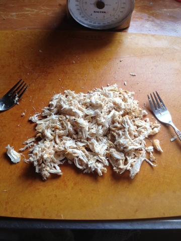 I baked one Wegman’s mojo marinated chicken breast, and one balsamic rosemary. The mojo, I decided to shred, so it would be pulled chicken. nom nom nom. I split each breast into two containers (4 total), separate from the salad, so I can microwave it at lunch and have hot chicken on my salad. So fantastic!