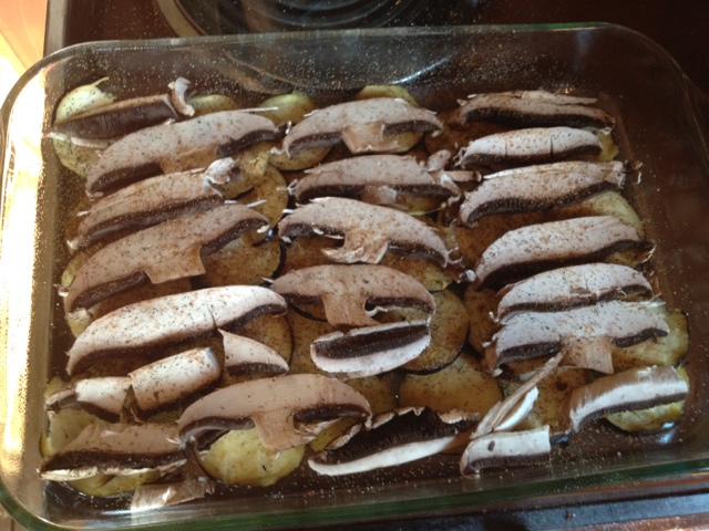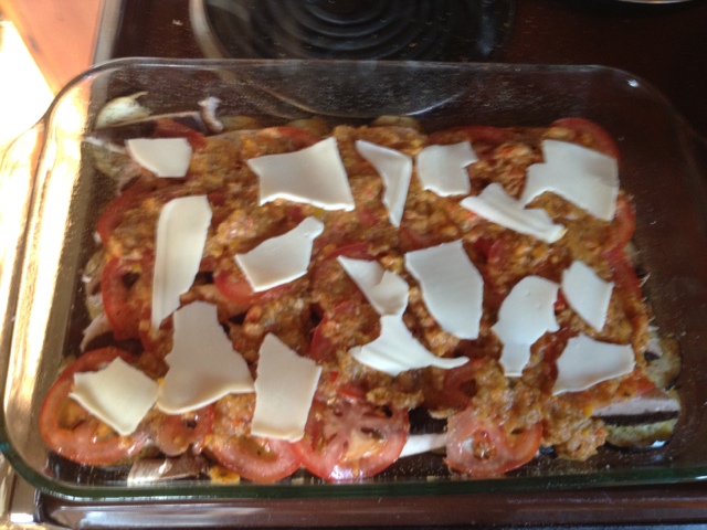 Repeat with one more series of eggplant, seasonings, mushrooms, seasonings, tomatoes, seasonings, sauce and mozzarella. Sprinkle parmesan on top and cook in oven at 350, for about 30-45 min.