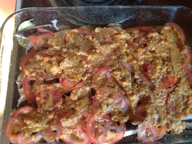 Spray a casserole dish, and line with 1/2 the sliced eggplant.