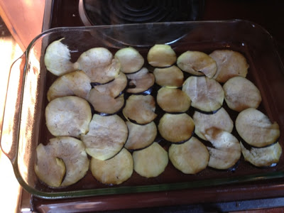 I highly recommend a mandolin for slicing. They are fabulous, and slice veggies way better than I ever could. Season the eggplant with garlic powder, pepper, Mediterranean seasoning and/or any other preferred seasonings.