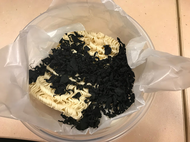 Then I placed a piece of wax paper on that, to separate the “wet” ingredients from the “dry” ones. That is simply the dried noodles and the wakame seaweed. Keep in mind that the seaweed is an acquired taste. It also will blow up, and can consume your bowl, if you add too much.