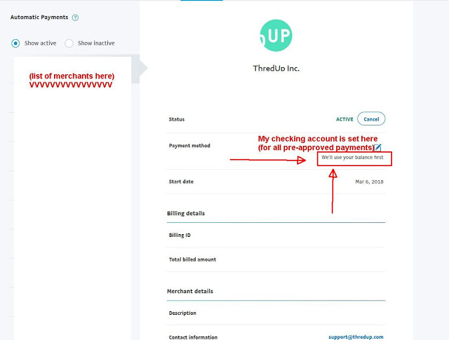 I finally get to talk to someone, and we go over what happened. The rep (who was nice and trying to help) informed me that while I can have a default method for my payment, from Paypal, I may have a different default, with approved vendors (payees). He asks me to sign on to my account, so he can show me where.