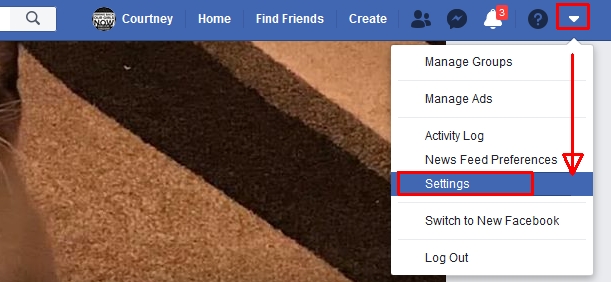 Now comes the main attraction in this clean up. Settings. On the top of the facebook page, on the right side of the navigation bar, is an upside down triangle. Single-click this, and you will see a drop down menu. Hover down to Settings, and single-click that option.