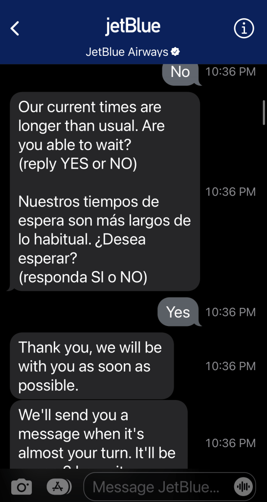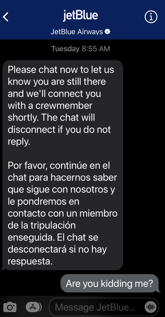 I wanted to circle back on some of this. The night that I spent with JetBlue on multiple support calls, I had also initiated a live chat, which I was told by a pop-up message would be faster than a live call. I was informed that it would be a 2-hour wait. This was at 10:36 PM on 4/4.