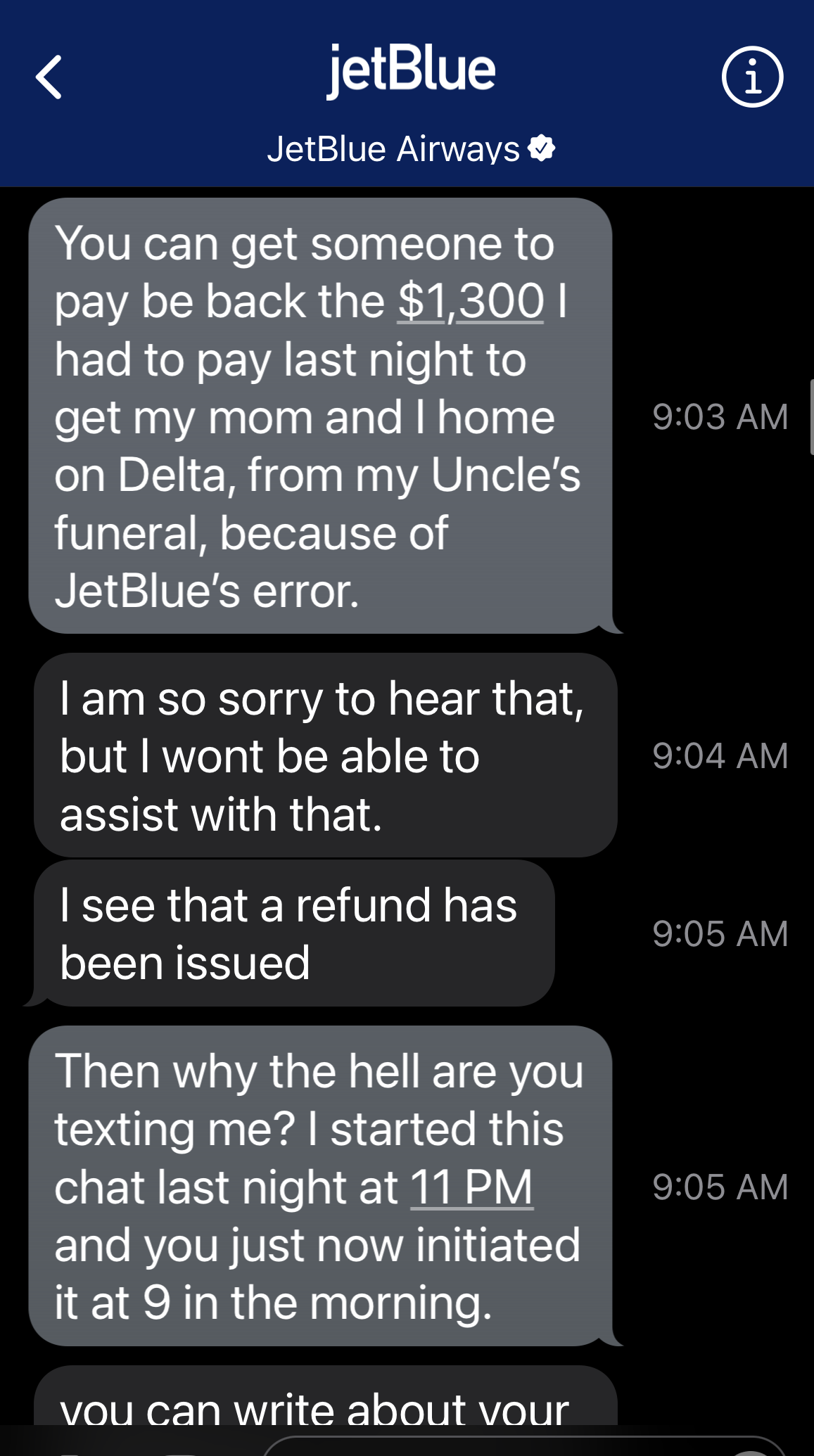 Looking at my mom and seeing that she just wants to get home, I keep Ariana on the phone while I book the last two seats on Delta, totaling another $1,400 that JetBlue is refusing to take responsibility for. I ask Ariana, who granted had done her best with what she was allowed to do, to please cancel and refund our flights home because this is the only way I can see to get us home without causing my mom more stress.