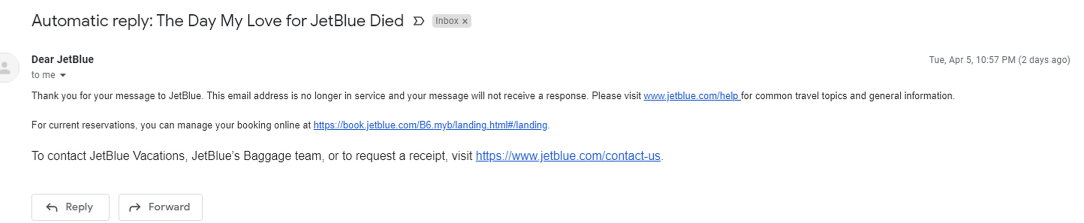 I hope this gets to someone at JetBlue, who will make this right. At this point, after what turned into over 4 hours of frustration with no one at JetBlue taking the responsibility they should have taken to fix their own problem, I’m not holding out any hope.