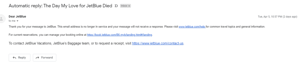 It doesn’t seem that JetBlue values my business at all. The odds of them making this right are slim, but I’ll keep trying to reach someone, as the Delta trip home should not be on us, when they deleted our trip and cost me hours of time, fighting with them only offering to not get us directly home without us paying extra costs and time, and limiting our time with our family.