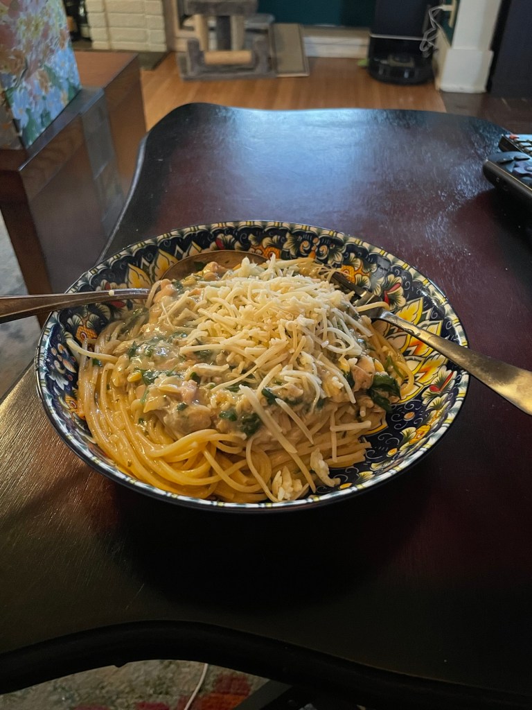 It’s not really famous, but I love it and I grew up with it. I would eat it for breakfast when I was a kid. It has always been my favorite meal. I consider it better than any spaghetti clam sauce I’ve ever gotten at a restaurant. Now I’ve doubled the ingredient list, because when I make it, I’m making it for the week. It’s a meal prep recipe for me. You can cut this in half if you don’t want to do as much.